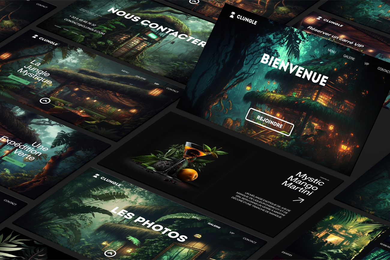 "Clungle est une aventure digitale unique pour les amoureux de la nuit et de l'exotisme. Ce projet innovant propose une boîte de nuit virtuelle plongée au cœur d'une jungle mystérieuse. Les visiteurs sont invités à s'immerger dans un univers verdoyant et envoûtant, tout en profitant d'expériences exclusives telles que des cocktails spéciaux et des réservations VIP."